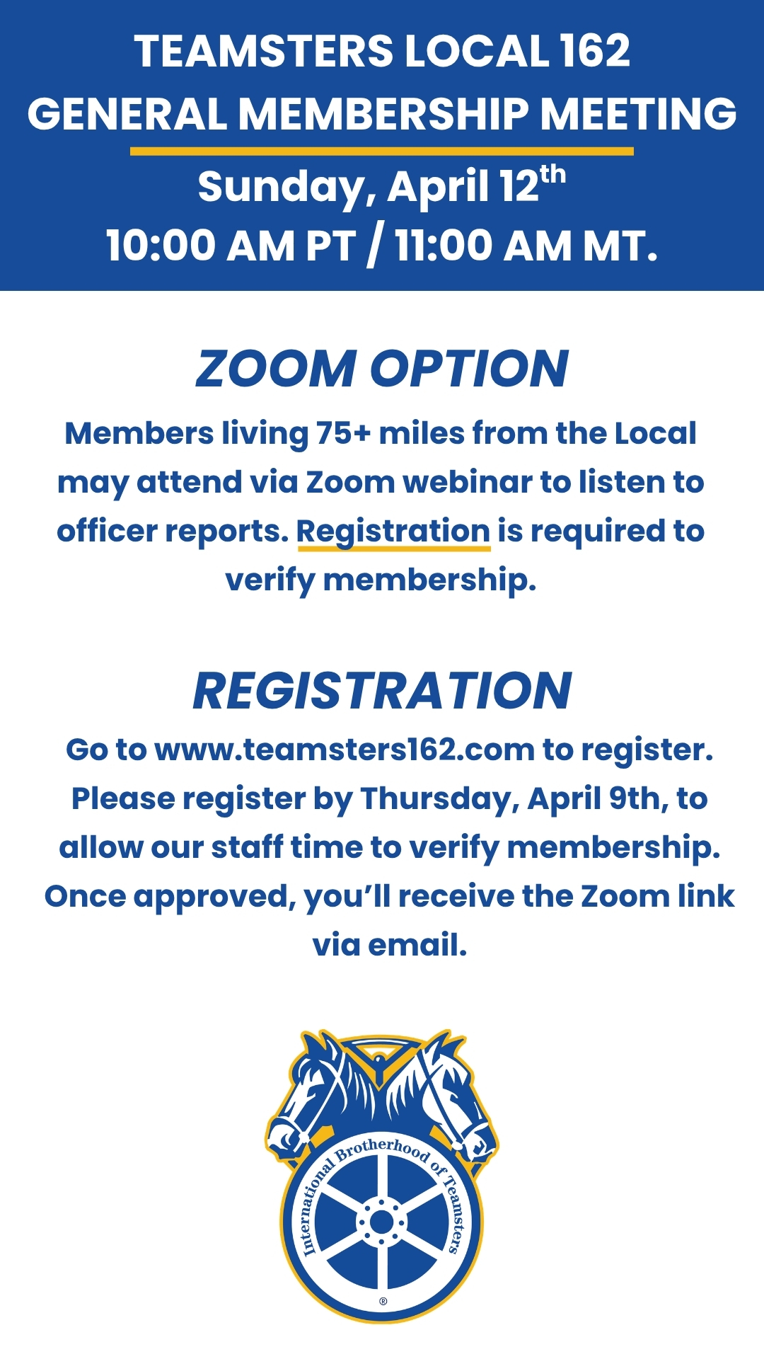Teamsters Local 162 – April General Membership Meeting The Teamsters Local 162 April General Membership Meeting will be held on April 12th at 10:00 AM PT, at Joe Edgar Union Hall in Portland, OR. For members who are 75+ miles away from the Local, you may join via Zoom to hear reports of Officers.